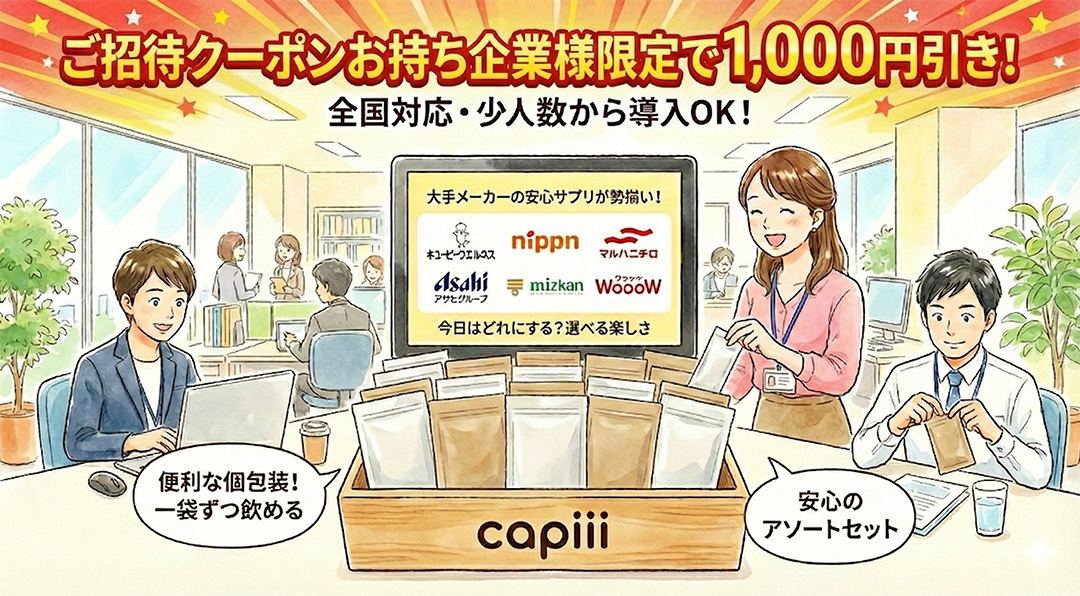■capiii(キャピー)とは? 大手メーカー(キユーピーウエルネス、ニップン、アサヒグループなど)のサプリメントをオフィスに設置できる、従業員向けの福利厚生サービスです。
