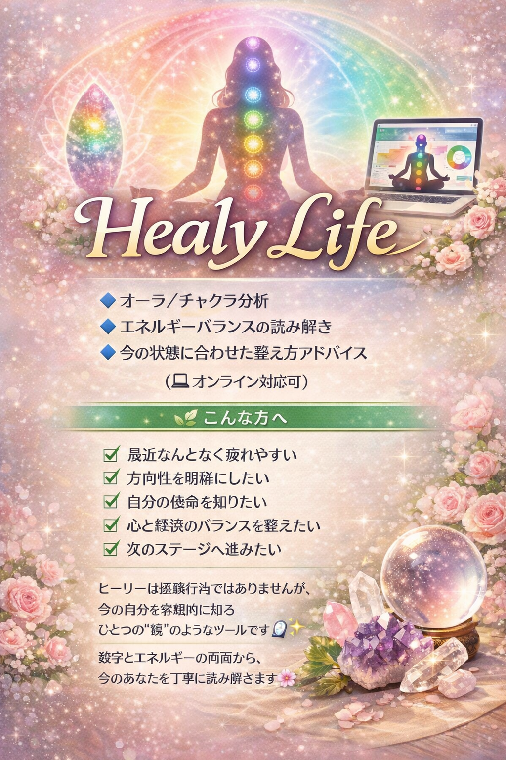 ヒーリーを活用し心と体とエネルギーを整える遠隔サポート。レゾナンスの分析で今の状態を可視化し必要な周波数を選択。丁寧なフィードバックと、アファーメンションで内側から整う体験をお届けします🎀
