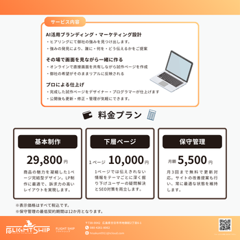 さらに、AIをフル活用してページ全体にマーケティング戦略を組み込み、「見てもらえるだけ」ではなく**「集客につながるHP」**を提供します。定期的な戦略提案もセットで、あなたのビジネスの成長を継続的にサポートします。