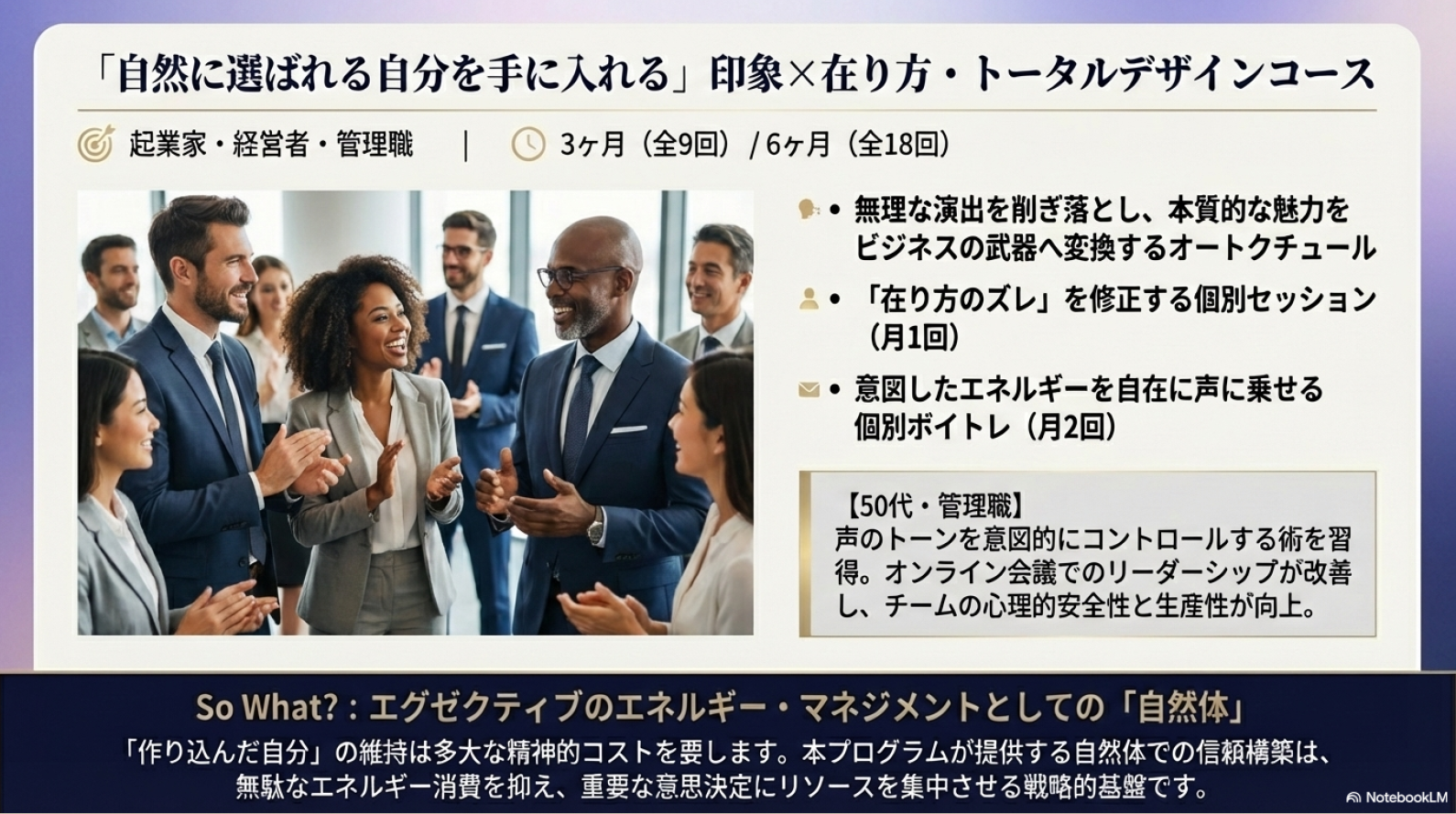 ・印象と在り方のセッション 月1回90分:「強み」を武器化し、どんな場面でも最高の自分でいられるセルフプロデュース力を習得。