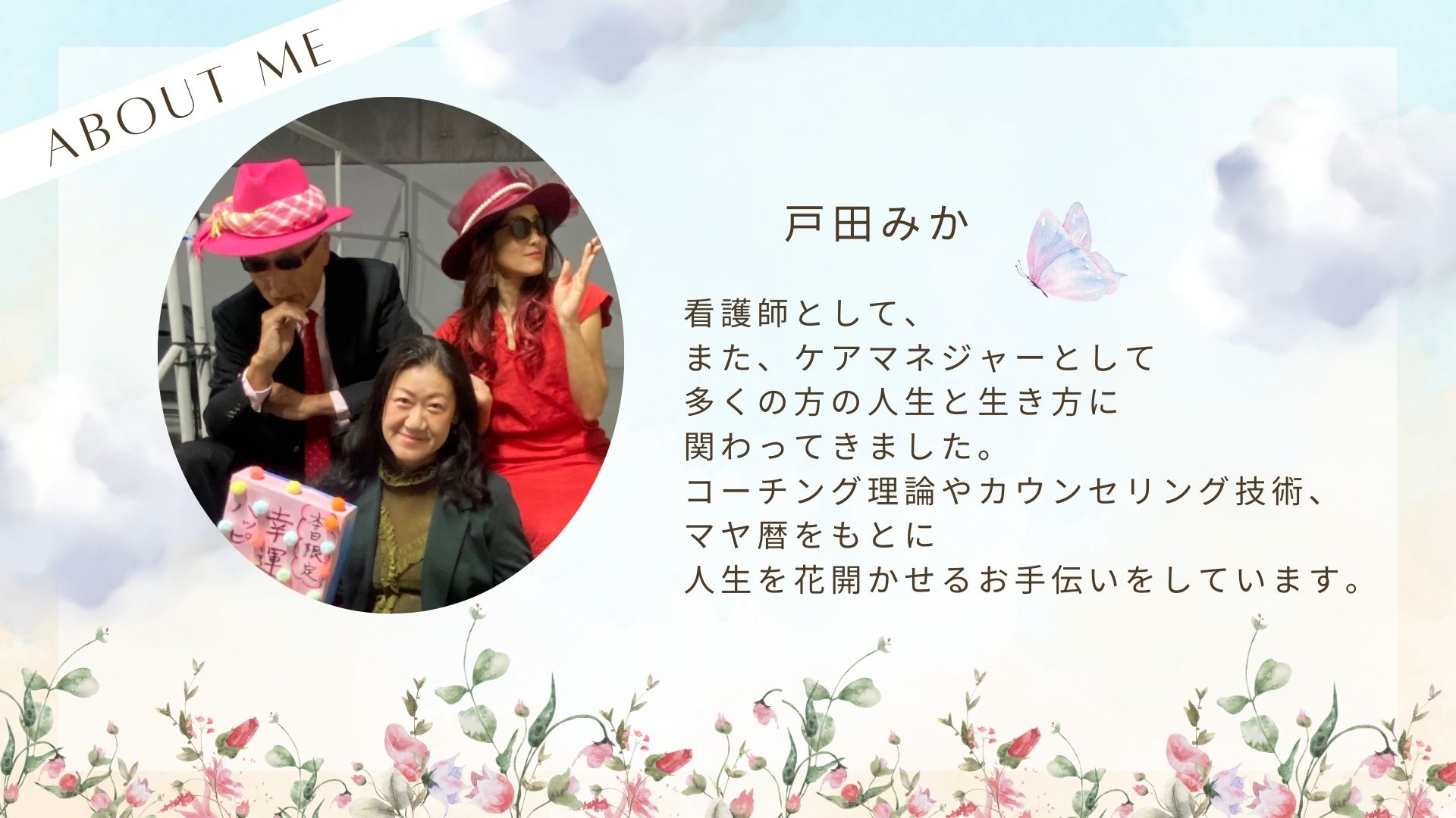 今までに私が学んできた自己啓発やコーチングなどの知識と実践、看護師やケアマネジャーとして人と向き合い支えてきた経験、さらにマヤ暦やヒーリングなどの叡智を活用して、ひとりひとりにじっくりと向き合います。