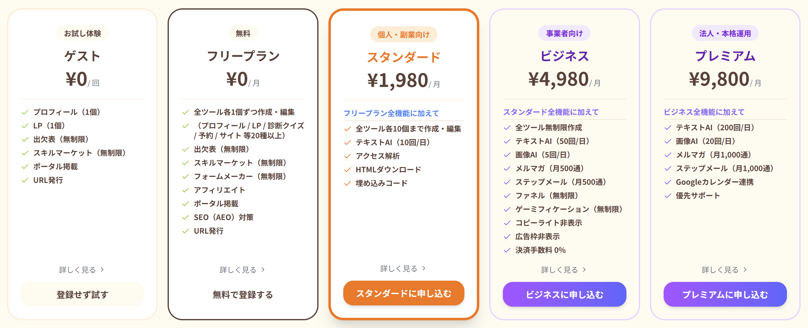 集客って、LP作成、予約、フォーム、ファネルなどをバラバラのサービスで用意することが多くて、手間もコストも増えやすいです。