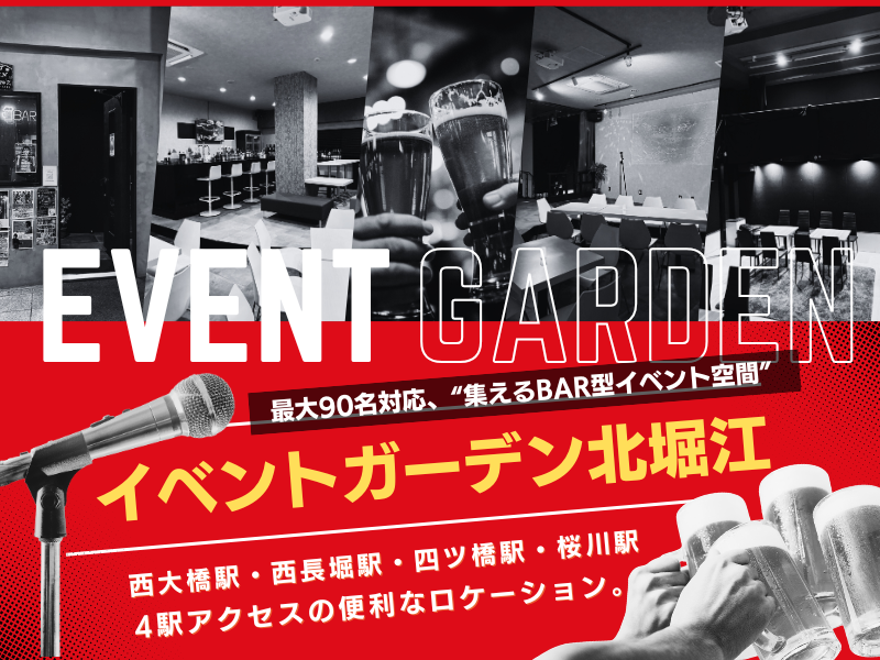 お酒と料理を楽しみながら、ライブ(ステージ)もマルシェも自由に開催。 防音設備完備・最大90名対応、北堀江の“集えるBAR型イベント空間”。 【 4Way Access 】 ~参加者が集まりやすい4駅アクセス~ イベントガーデン北堀江は、4駅からアクセス可能な好立地。各方面から集まりやすく、イベントやパーティーの会場としても便利なロケーションです。 1️⃣ 西大橋駅(3番出口)より徒歩約4分 2️⃣ 西長堀駅(3番出口)より徒歩約5分 3️⃣ 四ツ橋駅(6番出口)より徒歩約7分 4️⃣ 桜川駅(5番出口)より徒歩約10分 大阪市内各所からスムーズにお越しいただけます。 仕事帰りの一杯にも、イベント参加にも便利なアクセス環境です。