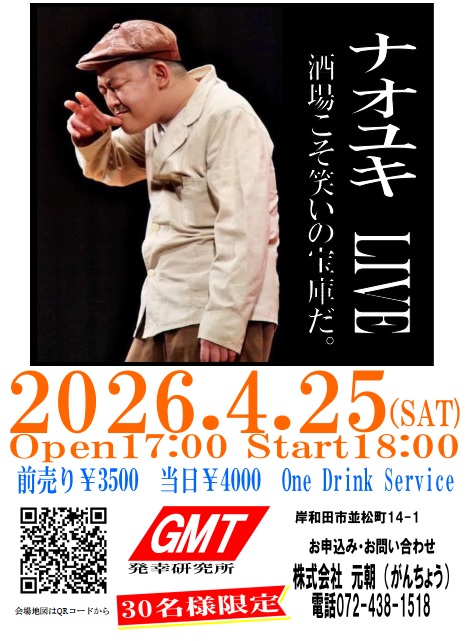 笑点や繁昌亭にもご出演中の酒場漫談のナオユキさんが岸和田に爆笑ネタを引っ提げて帰って来る!