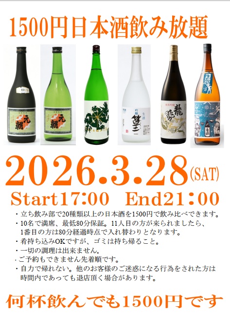 店にある日本酒は大体飲めます。LINK見てきた!とおっしゃっていただいたら、2杯目を無料サービスします。日本酒焼酎60CCで300円です。