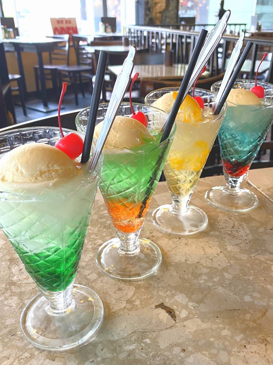 人気メニューのクリームソーダは、鮮やかなカラーが目を引く映えアイテム。