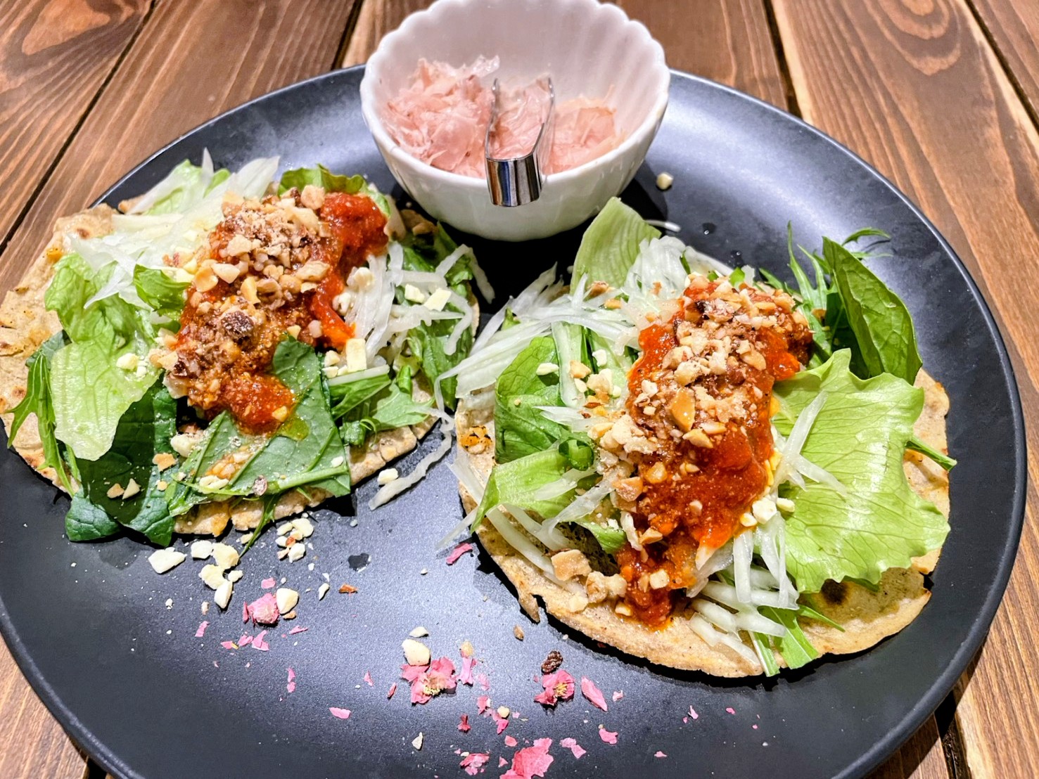 鰹節、※カケナッツ、燻製オリーブオイル等をかけた