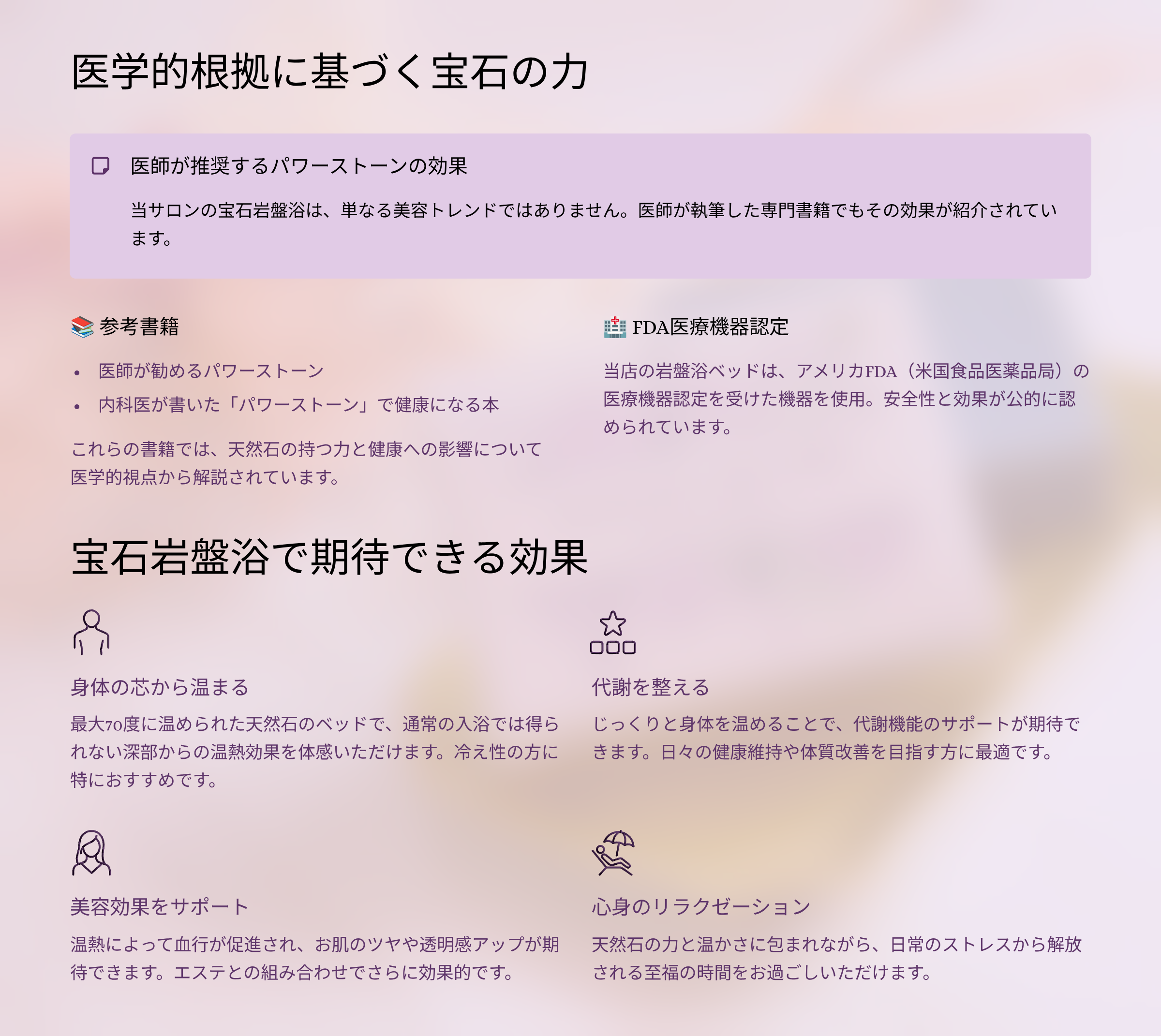当店の宝石岩盤浴ベッドは、アメリカFDA(日本の厚労省に相当)医療機器認定を受けた機器を使用。