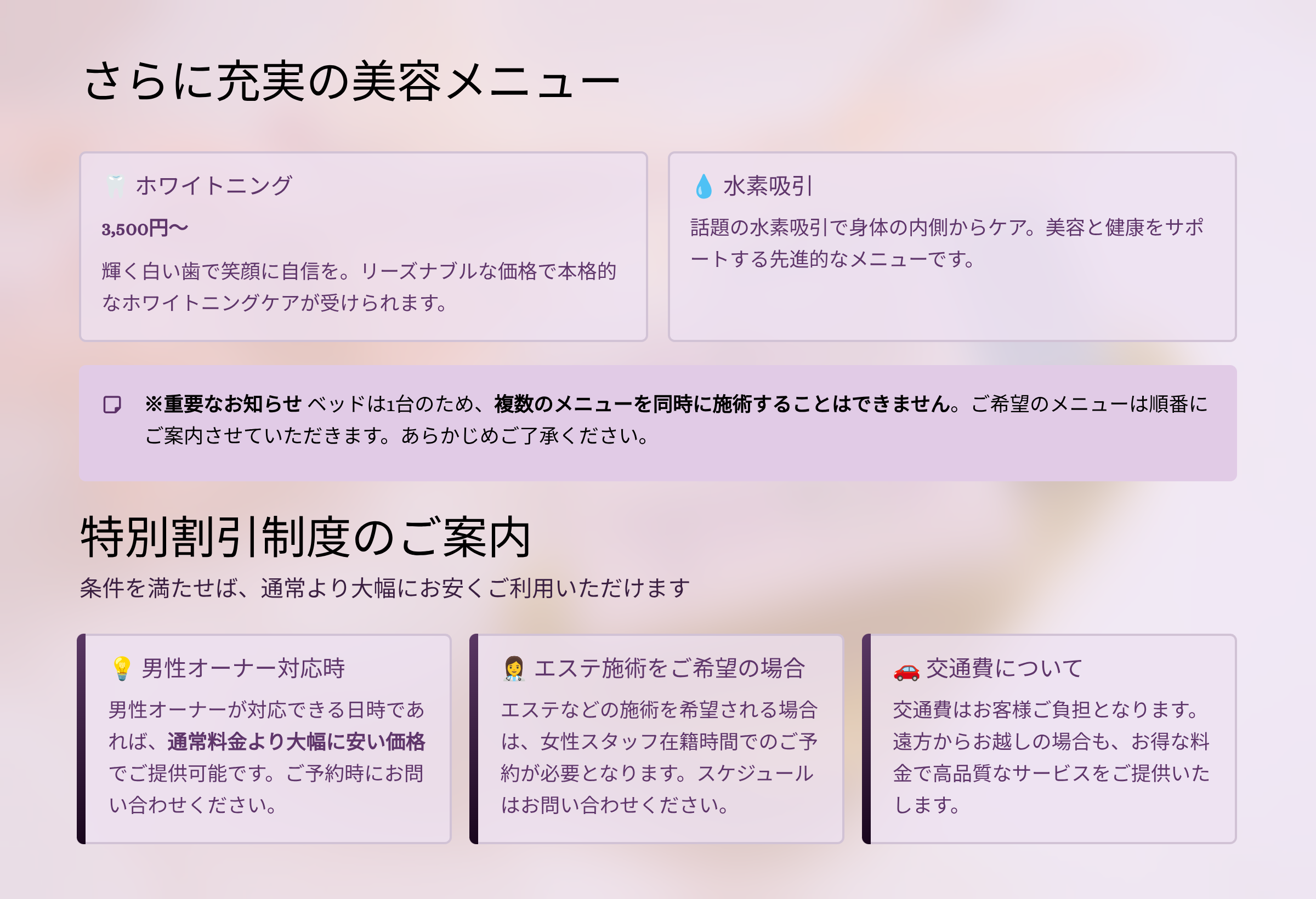 エステなど施術を希望する場合は、別途スタッフ在籍時間でのご予約が必要です