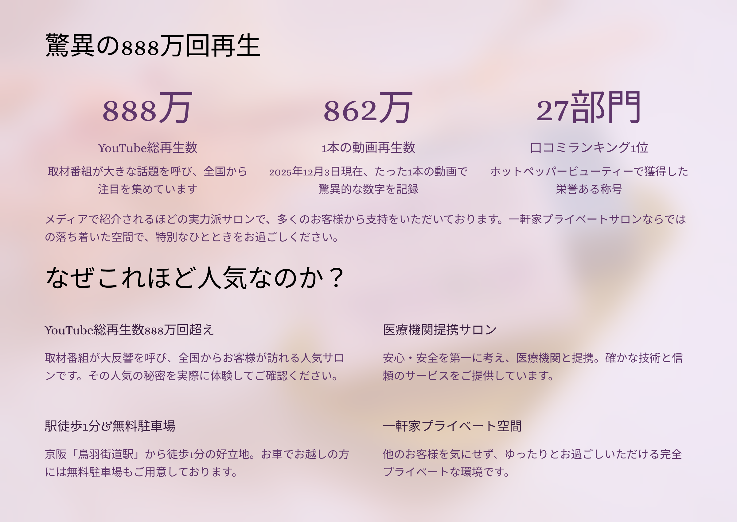 宝石岩盤浴を楽しみながら、エステや脱毛まで受けられる当サロンは、YouTube取材番組が総再生数888万回を突破し、遠方からも多くの方にご来店いただいています。