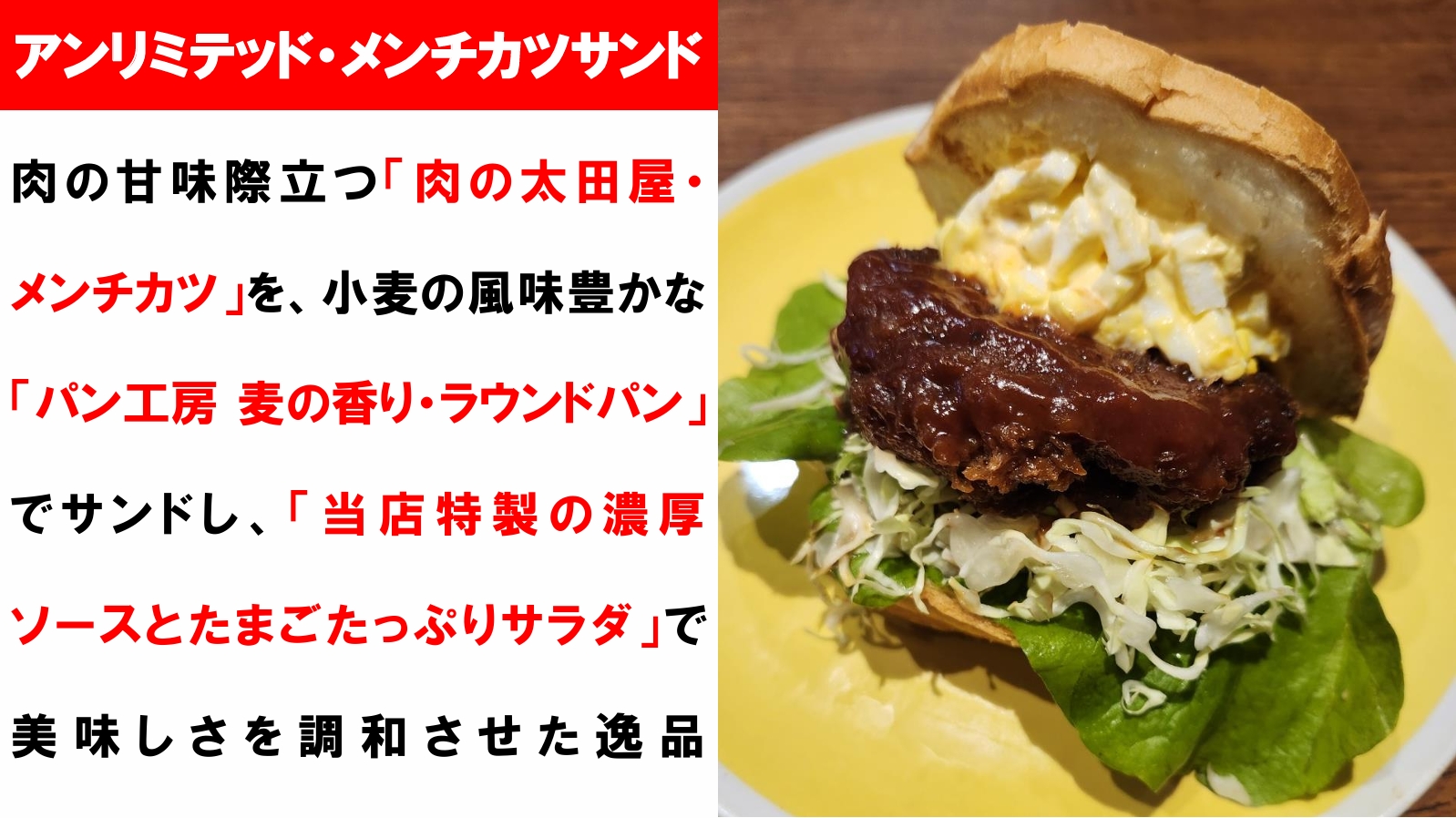 当店では、このメンチカツを、小麦の風味豊かな「パン工房 麦の香り」様のパンでサンドし、当店特製の濃厚ソースで美味しさを調和させた「メンチカツサンド」をご提供しています。