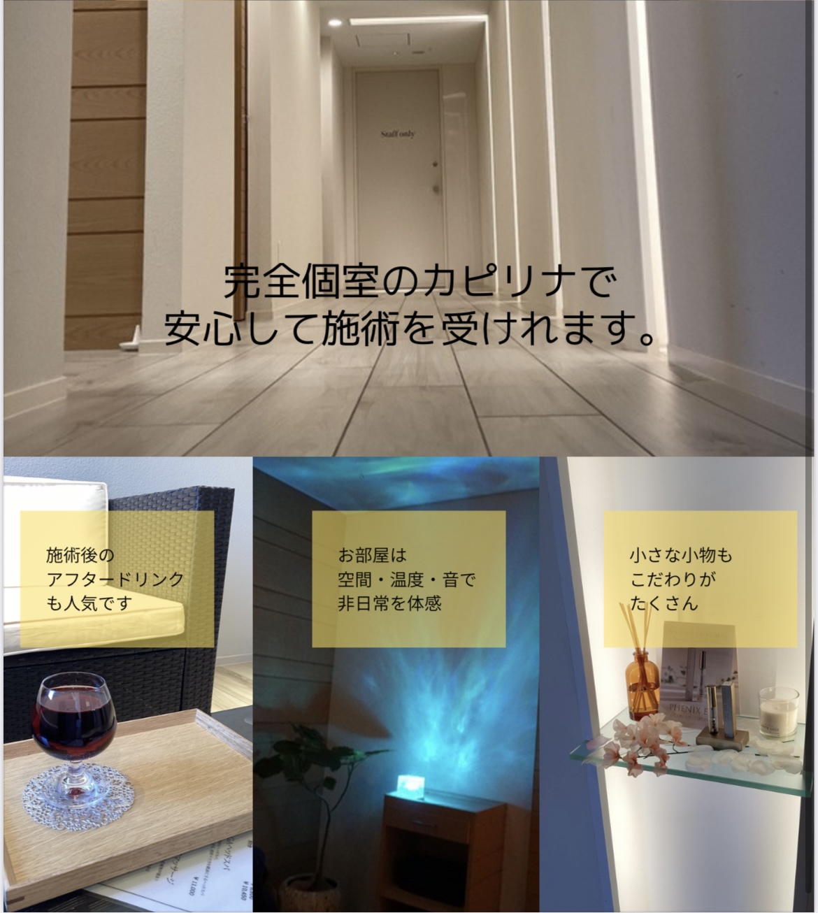 さらに、当サロンは完全個室・全3部屋。 おひとりでゆったりと過ごすのはもちろん、