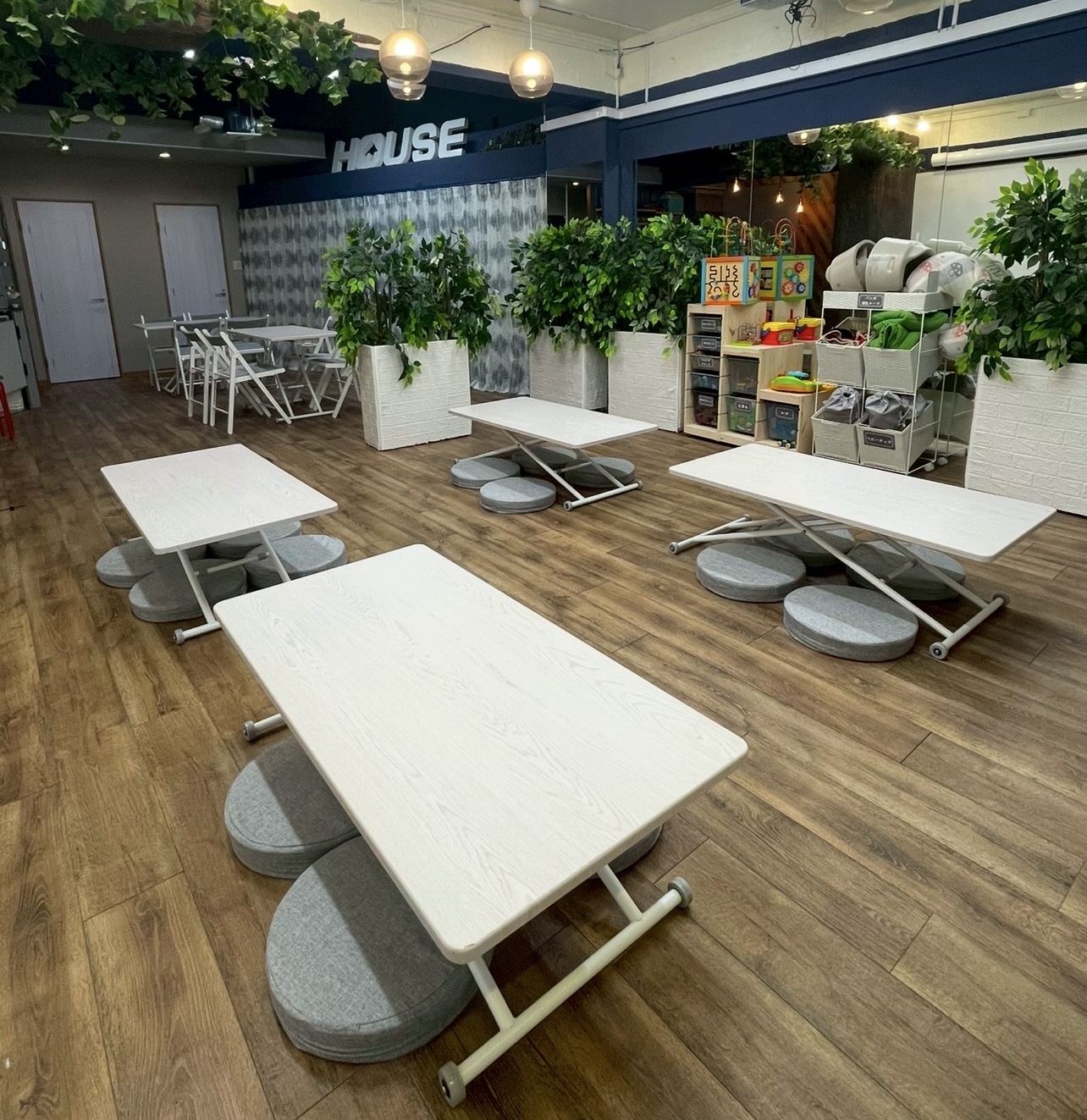 | 定員 | 〜40人 (昇降式 4名がけテーブル×6台、椅子8脚、丸椅子4脚、クッション27個) |